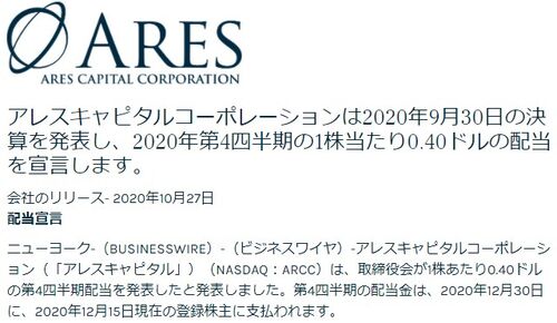 減配はなく維持されましたので一安心です。 高配当が魅力の米国株『ARCC』の決算発表が10/27にありました。 第4四半期配当の情報を確認する為HPを見に行った所 1株当たり0.4ドルを配当として支払うことを発表していました。 エイリス・キャピタルHPより Goog…